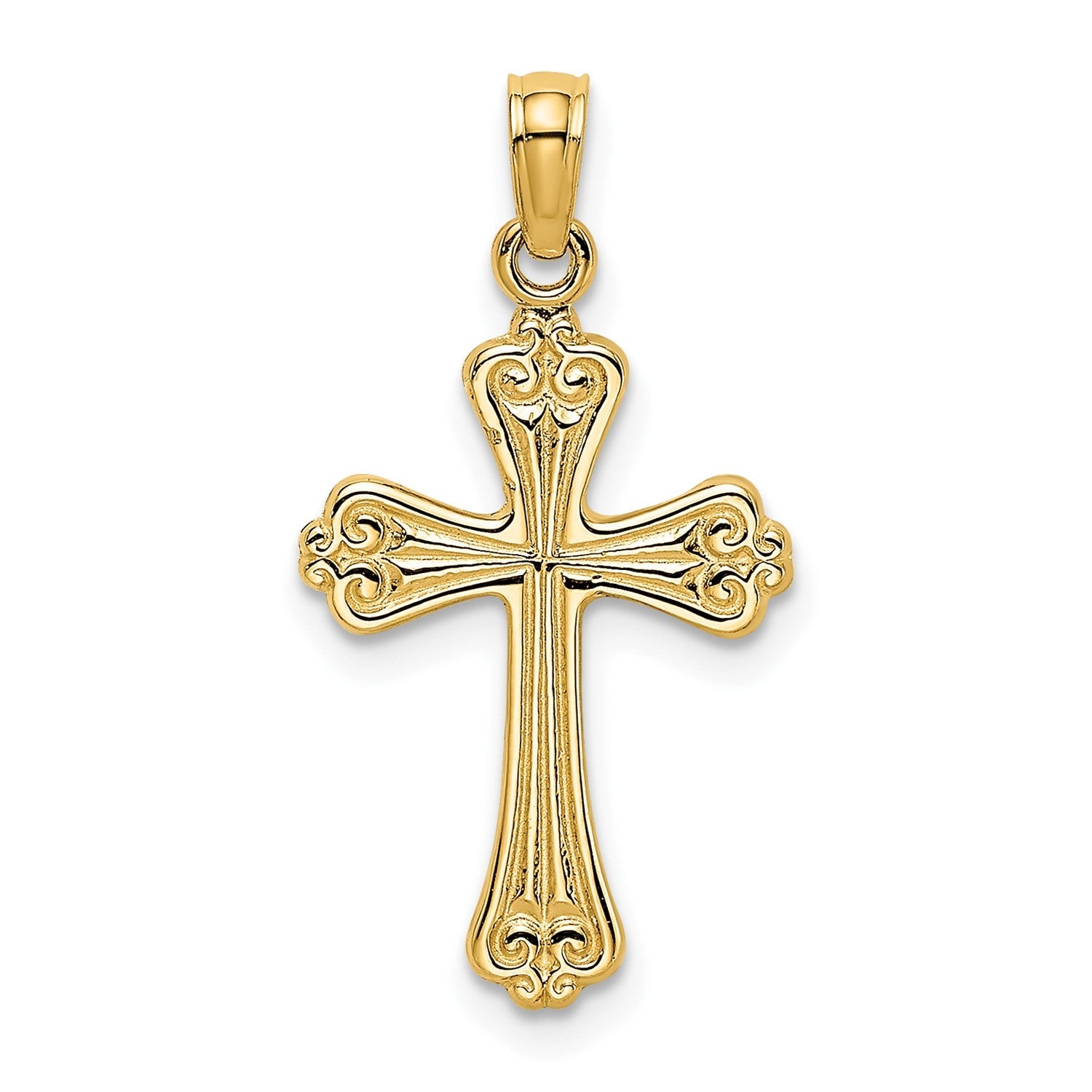 Crafted from 14K real yellow gold, this exquisite engraved cross charm pendant is a timeless symbol of faith and devotion. The intricate engraving on the surface adds a touch of elegance and sophistication, making it a cherished piece to wear or gift to someone special. With a classic design that never goes out of style, this pendant is perfect for everyday wear or as a meaningful addition to any jewelry collection. Measuring approximately 19x13mm it strikes the perfect balance between subtle and statement-making. Whether you're looking for a spiritual accessory or a beautiful piece of fine jewelry, this 14K yellow gold engraved cross charm pendant is a stunning choice that will be treasured for years to come.