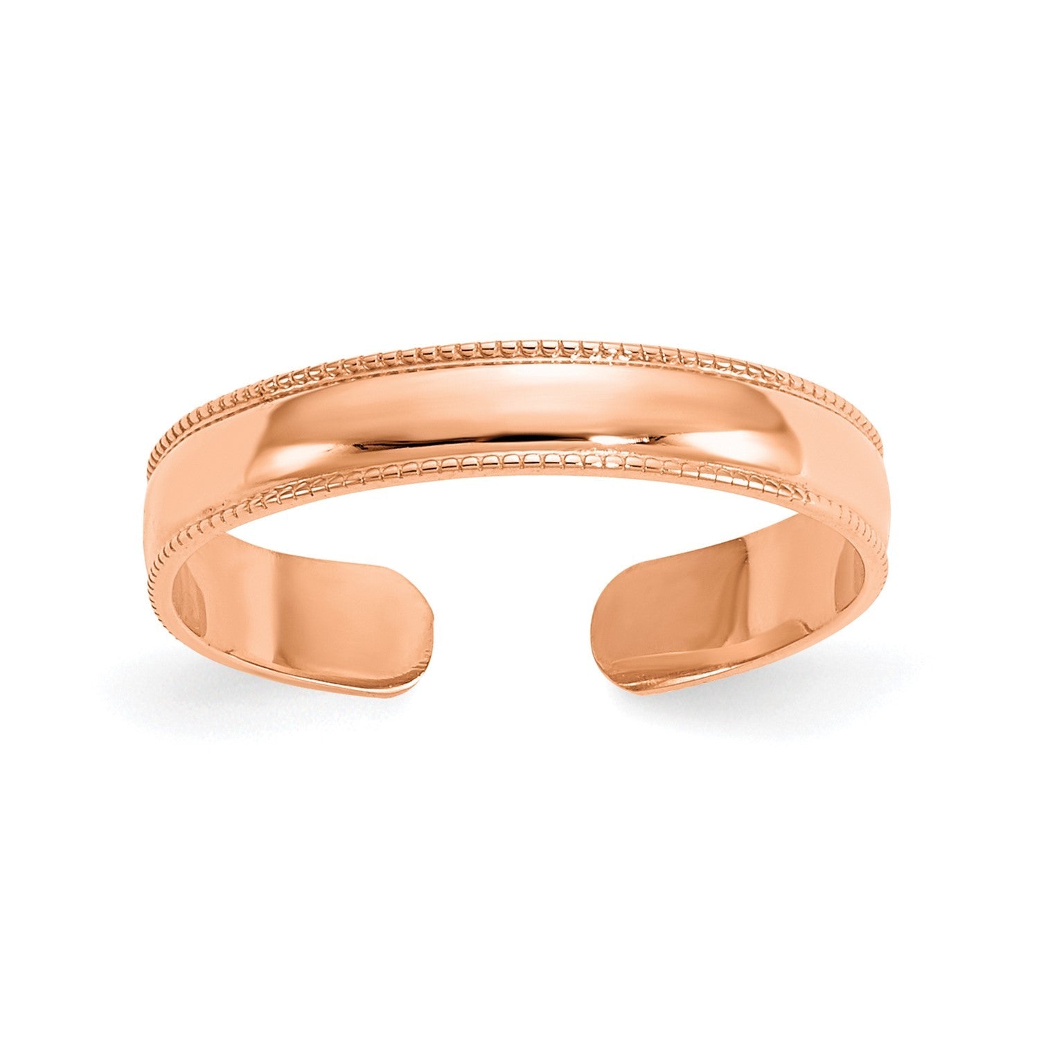 Elevate your jewelry collection with this exquisite 14k rose gold mill grain adjustable toe ring. Crafted from premium rose gold plated sterling silver, this delicate piece adds a touch of elegance to any outfit. The intricate mill grain texture creates a captivating shimmer that catches the eye. Designed for a comfortable and secure fit, the adjustable band allows you to find the perfect size for your toe. Whether you're dressing up for a special occasion or simply want to add a touch of glamour to your everyday look, this toe ring is a versatile and stylish choice. Pair it with your favorite sandals or open-toed heels for a chic and trendy accessory. Embrace the beauty of rose gold and let this toe ring be the finishing touch to your fashionable ensemble.