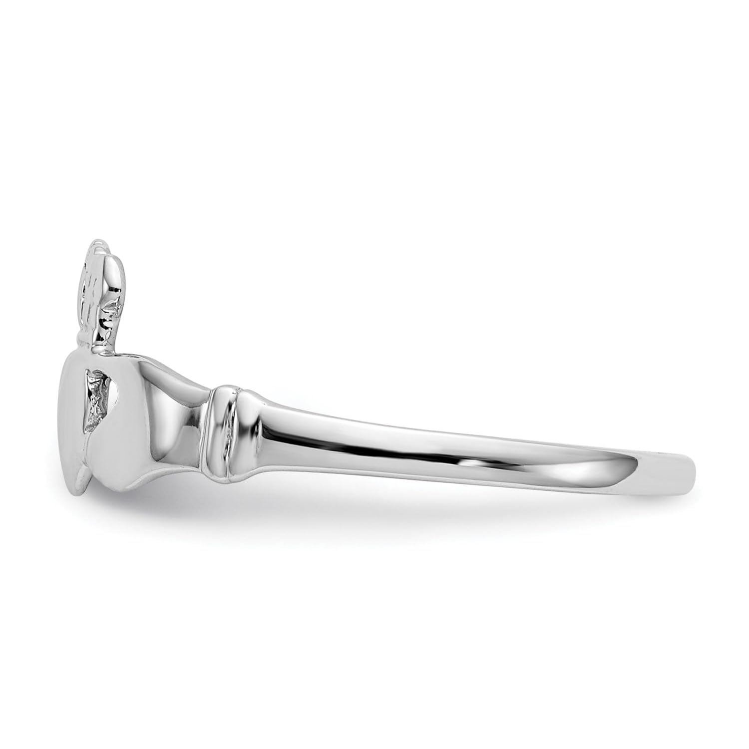 This elegant 14k white gold ring features the iconic Claddagh design, symbolizing love, loyalty, and friendship. The intricate detailing showcases two hands clasping a heart, topped by a crown, all expertly crafted in precious metal. With its timeless symbolism and beautiful artistry, this ring makes a meaningful gift for someone special or a cherished addition to your own jewelry collection. Comfortable to wear and perfect for any occasion, this size 6 ring will become a treasured keepsake for years to come.