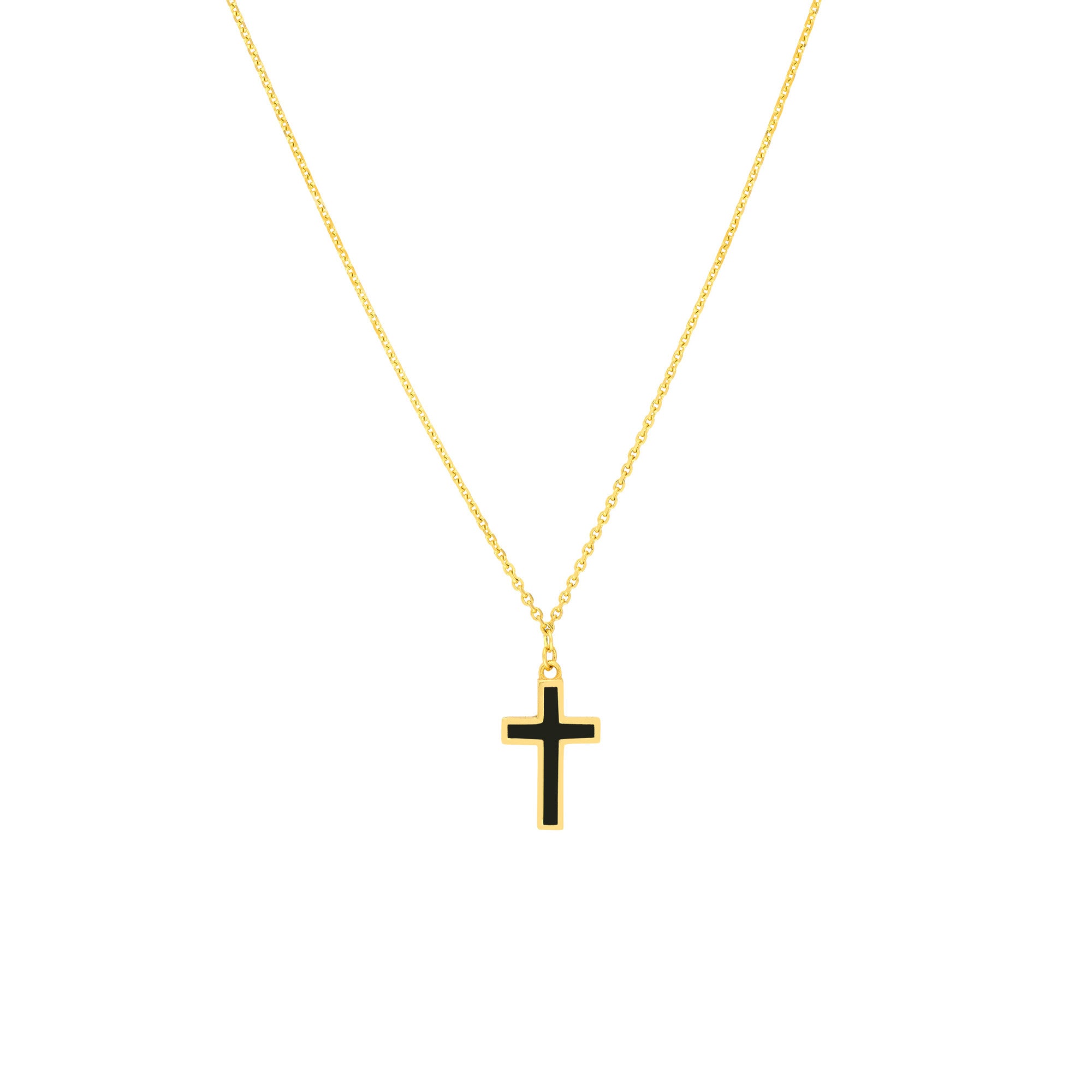 Elevate your style with this exquisite 14k yellow gold cross necklace, featuring a striking black enamel accent that adds a contemporary touch to this timeless design. The cross pendant makes a bold yet refined statement, perfectly balanced on an 18-inch adjustable chain that allows for versatile wearing options. The gleaming yellow gold provides a luxurious backdrop for the sophisticated black enamel inlay, creating a dramatic contrast that catches the eye. This piece seamlessly combines traditional symbolism with modern aesthetics, making it suitable for both everyday wear and special occasions. The durable construction ensures long-lasting beauty, while the adjustable chain offers a customizable fit for optimal comfort. Whether worn as a meaningful spiritual symbol or as a fashion statement, this cross necklace adds an elegant touch to any ensemble.