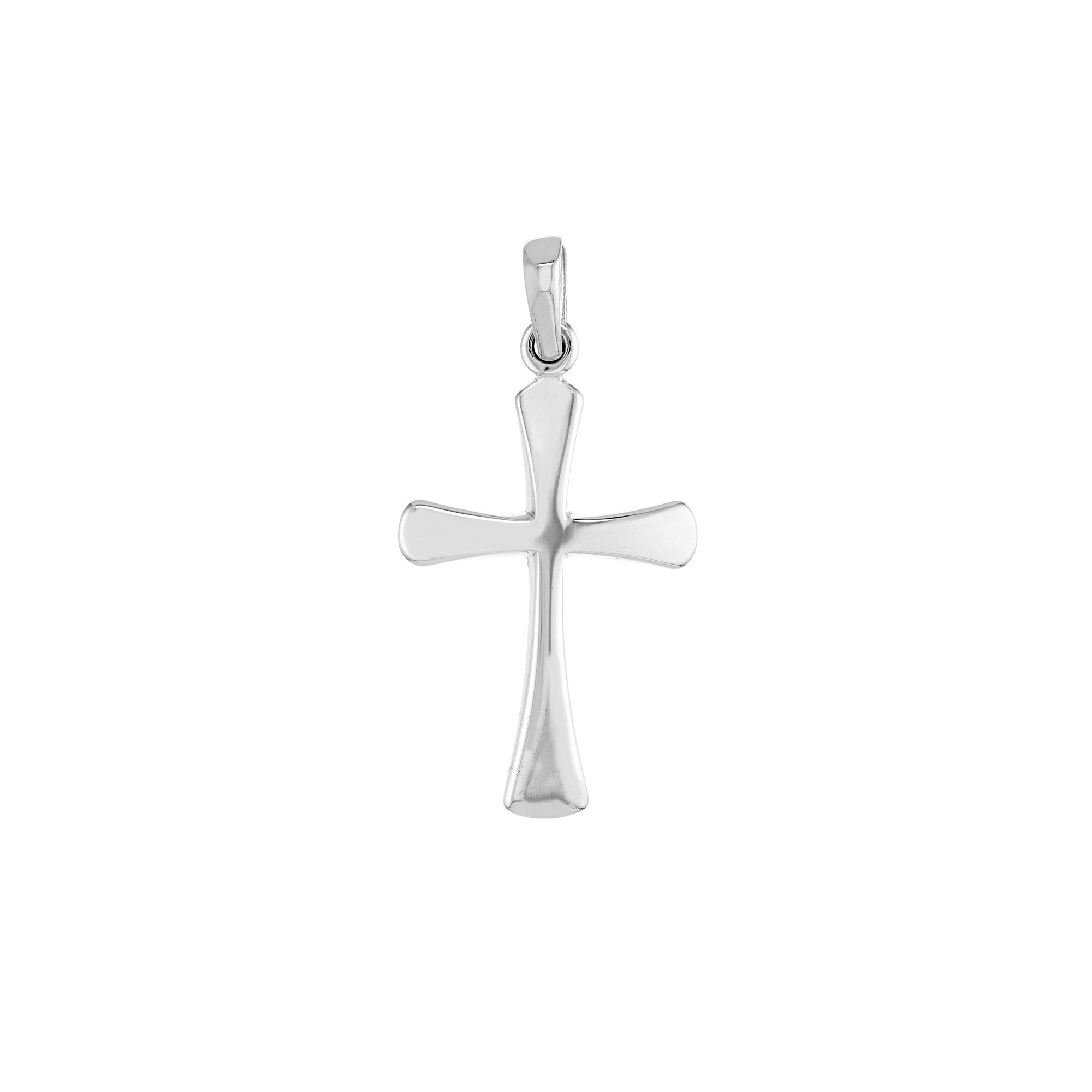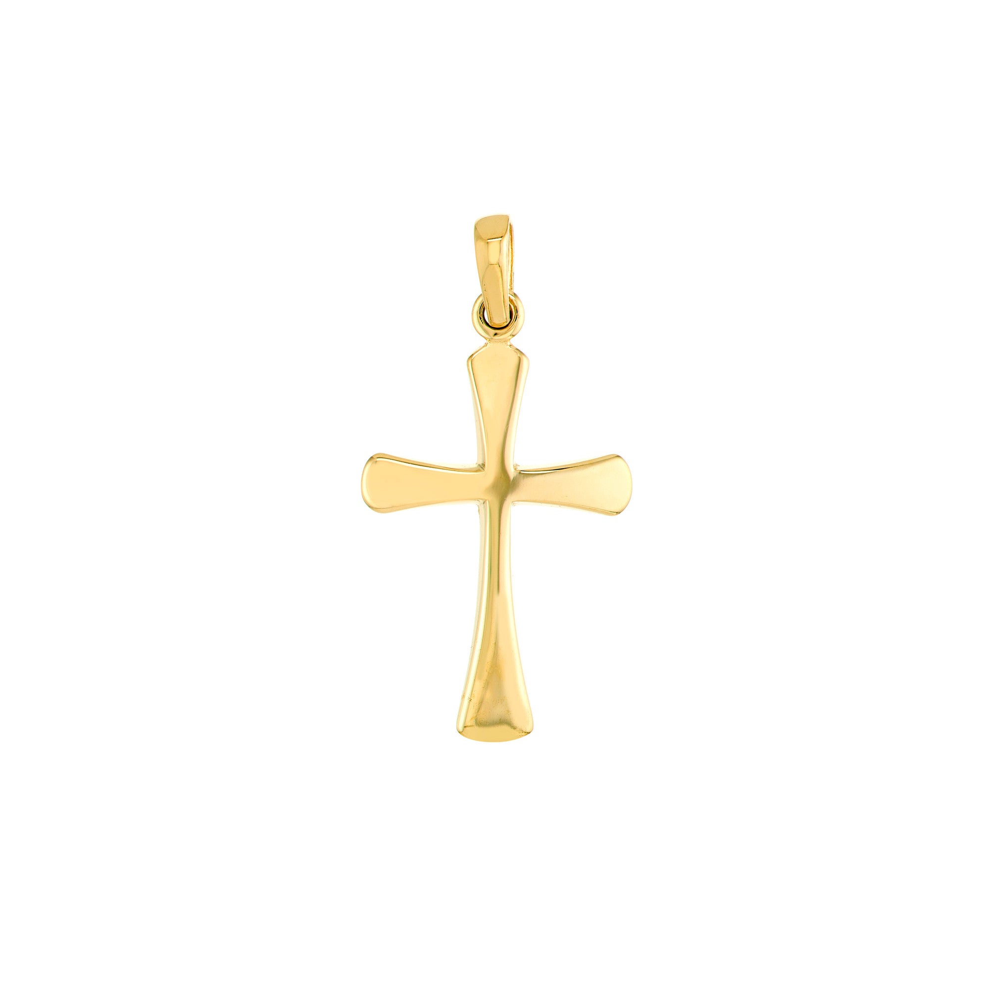 This elegant 14K yellow gold cross pendant makes a timeless statement piece for any occasion. Featuring gracefully flared edges that add a contemporary touch to the classic cross design, this pendant measures 1 inch in length - a versatile size that pairs beautifully with various chain styles. The polished yellow gold finish creates a warm, lustrous glow that catches the light beautifully. The pendant's balanced proportions and thoughtful craftsmanship make it an ideal choice for both everyday wear and special occasions. Its clean lines and sophisticated design make it suitable for all ages and styles, whether worn as an expression of faith or simply as a beautiful piece of jewelry. The durable 14K gold construction ensures this meaningful pendant can be treasured for years to come.