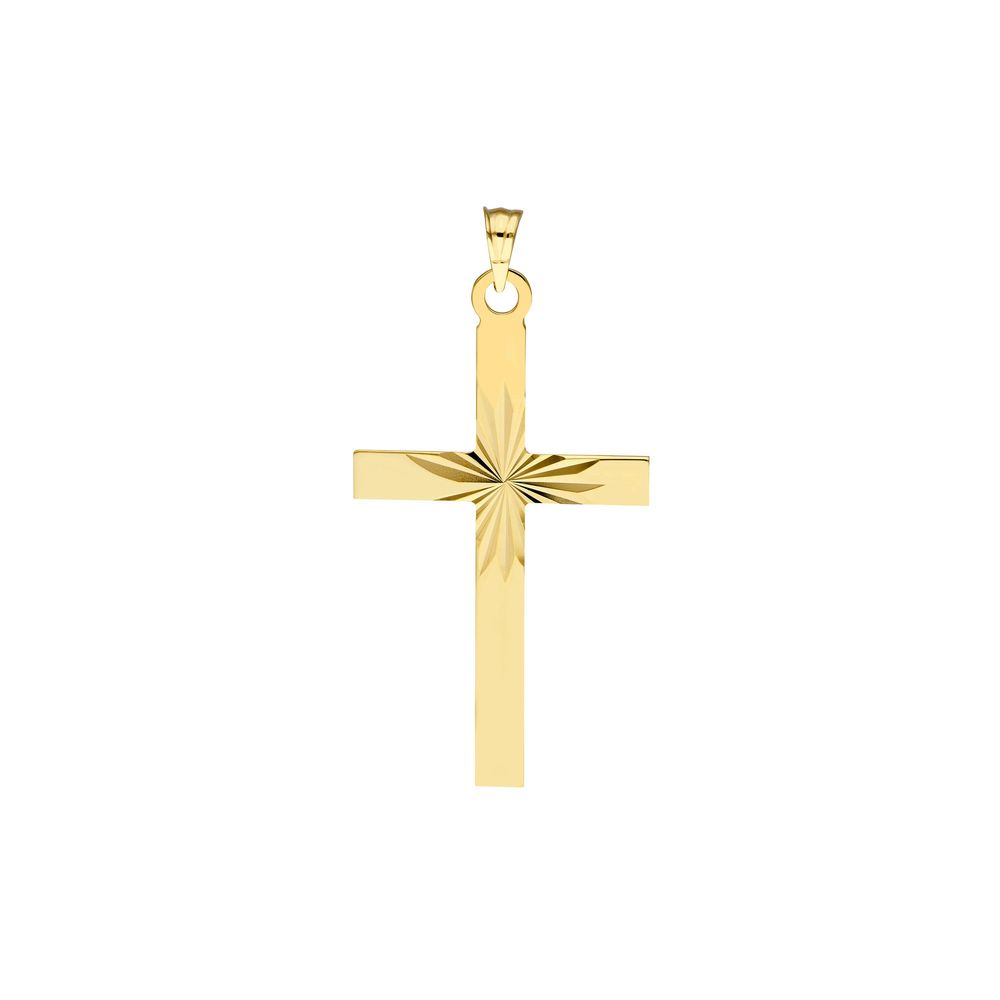 Elevate your spiritual expression with this exquisite 14K yellow gold cross pendant. Measuring 35x15mm, this beautifully crafted piece features a striking diamond-cut center design that creates an enchanting starburst pattern, catching and reflecting light with every movement. The sleek, polished finish of the yellow gold provides a timeless backdrop for the intricate detailing, while the pendant's proportions make it a versatile choice for everyday wear or special occasions. The clean lines and classic silhouette of this cross pendant are perfectly balanced, making it an enduring symbol of faith that can be treasured for generations. The secure bail ensures the pendant hangs properly when worn on your favorite chain. This meaningful piece of jewelry combines traditional symbolism with refined craftsmanship, making it an ideal choice for both personal wear and thoughtful gifting.