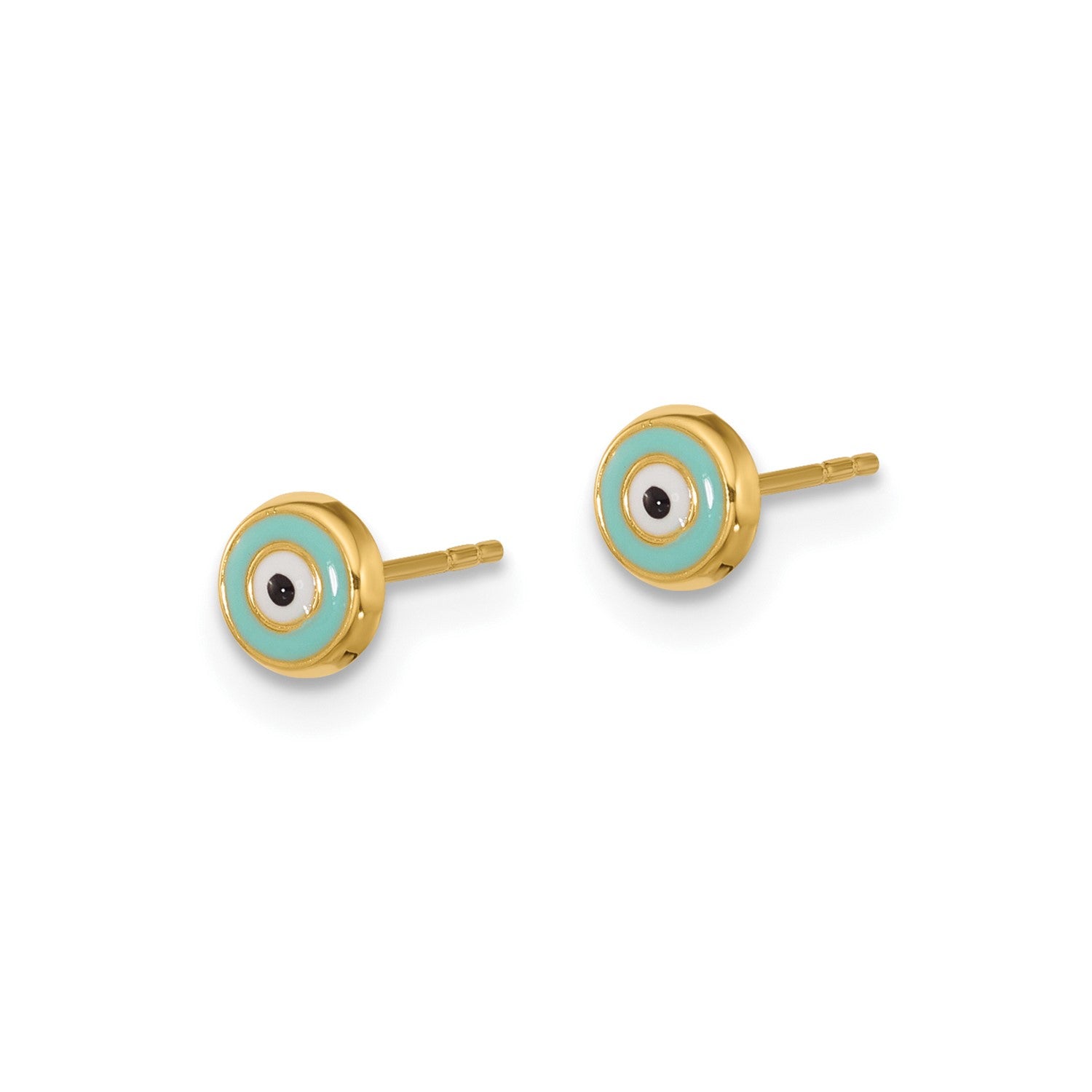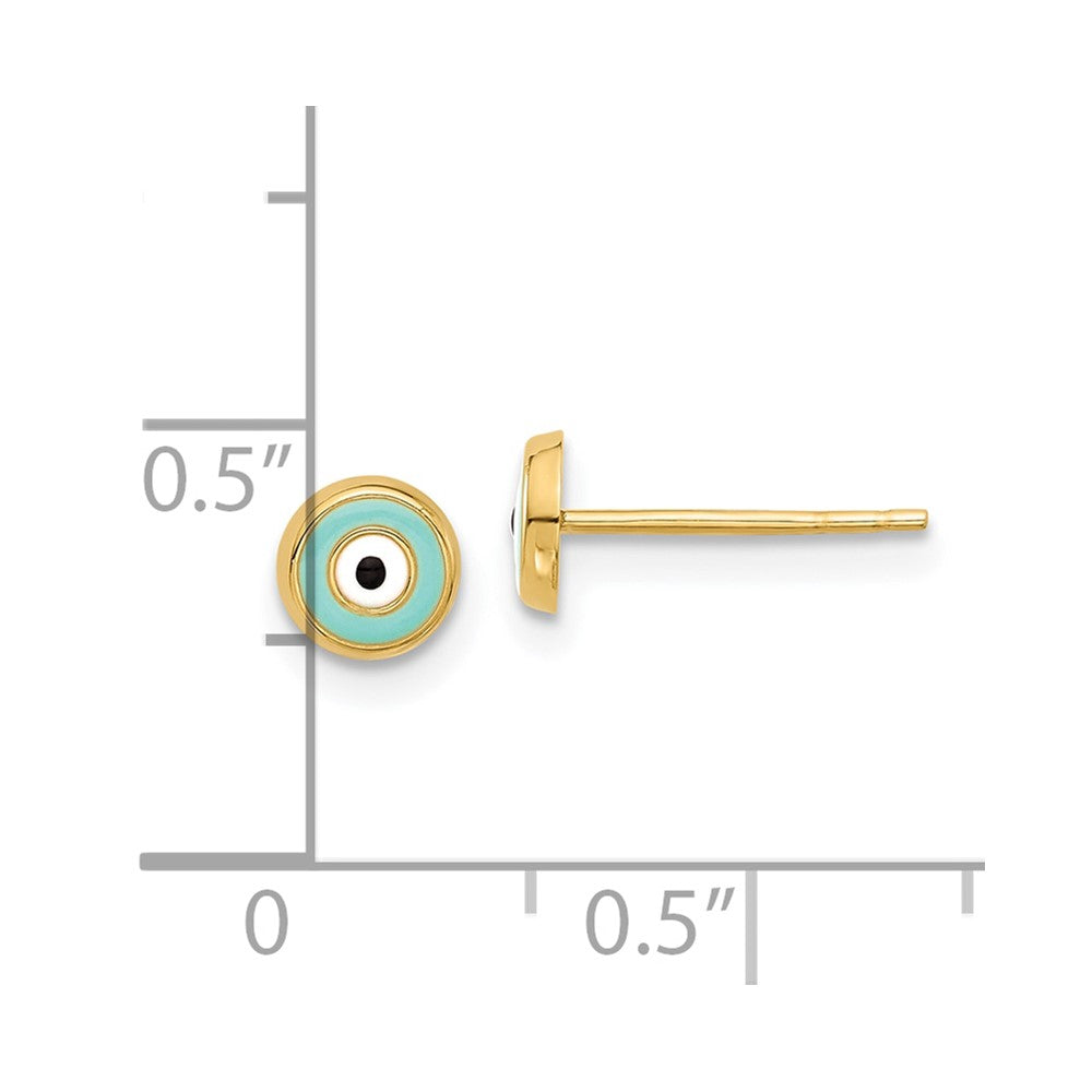 Elevate your jewelry collection with these exquisite 14K yellow gold evil eye enamel post stud earrings. Measuring 5mm in diameter, these earrings feature a captivating design inspired by the traditional evil eye symbol. The vibrant turquoise enamel surrounds a striking black enamel center, creating a mesmerizing contrast. Crafted from solid 14K yellow gold, these earrings are a testament to quality and durability. Whether you're dressing up for a special occasion or adding a touch of elegance to your everyday look, these evil eye earrings are sure to turn heads. Lightweight and comfortable to wear, they make an excellent addition to any jewelry enthusiast's collection.