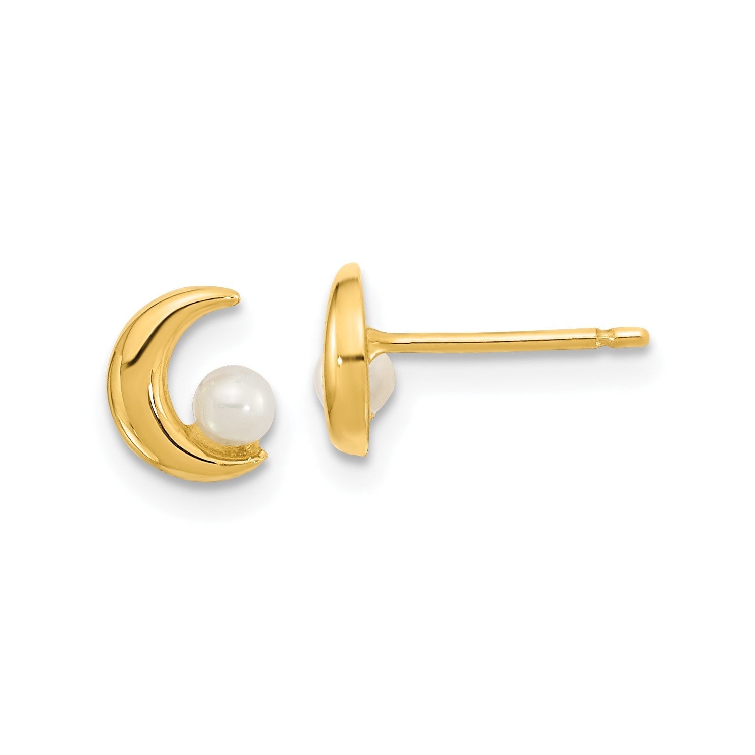 Elevate your style with these exquisite half moon stud earrings. Crafted from 14K yellow gold, these earrings feature a crescent-shaped design adorned with a captivating 2.5-3mm freshwater cultured pearl. The lustrous pearl adds a touch of elegance and sophistication to your look. These earrings are perfect for everyday wear or special occasions, effortlessly complementing any ensemble. With their timeless beauty and high-quality materials, these earrings are sure to become a cherished addition to your jewelry collection.