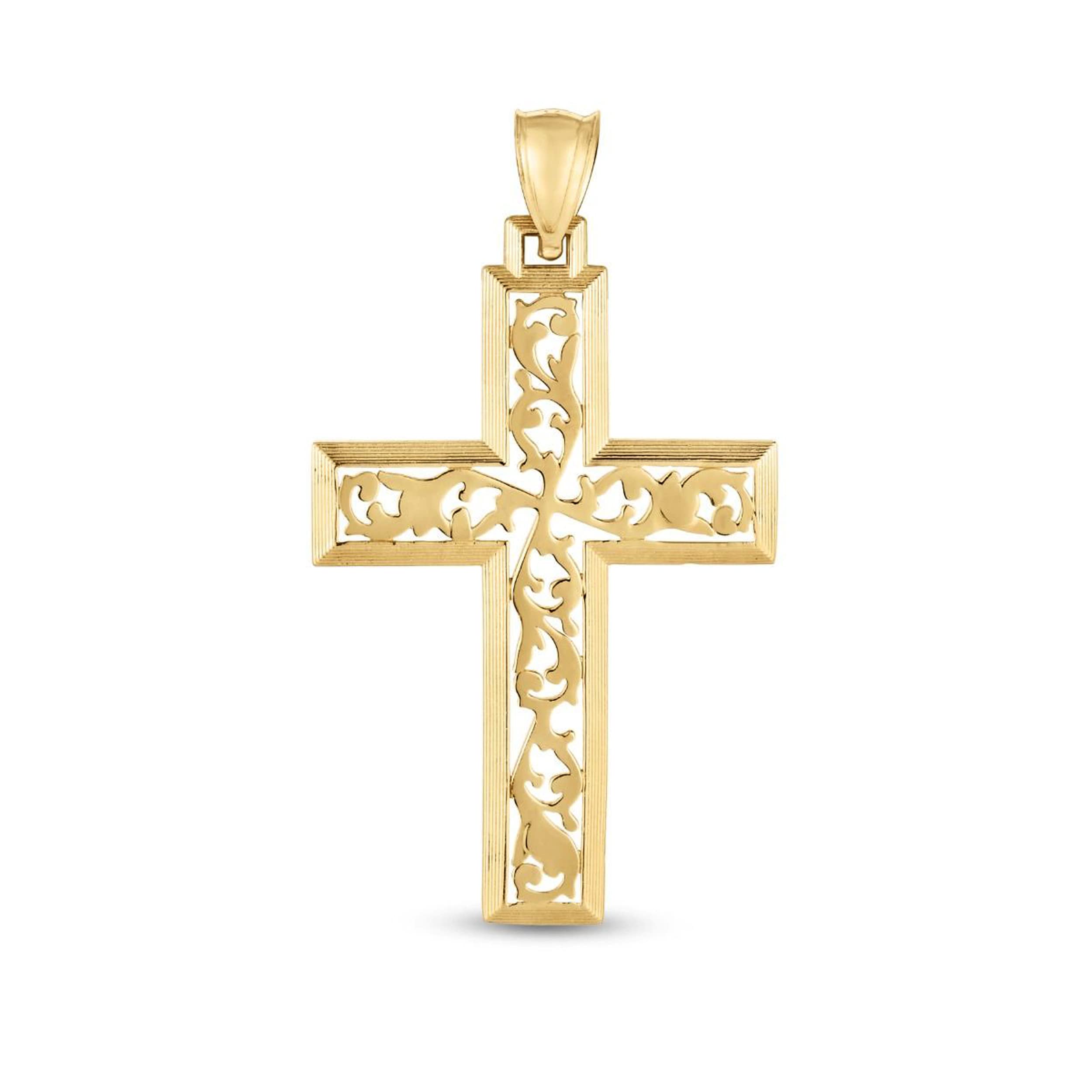 This 14K yellow gold fancy cross is the perfect way to honor your religion. A classic gift for the Christian religious occasion with gorgeous golden tones in a classic cross design. The simple look makes it perfect for everyday wear, whether on its own or layered with other delicate necklaces. This cross pendant is good for men, women and also children that would be great as a baptism gift