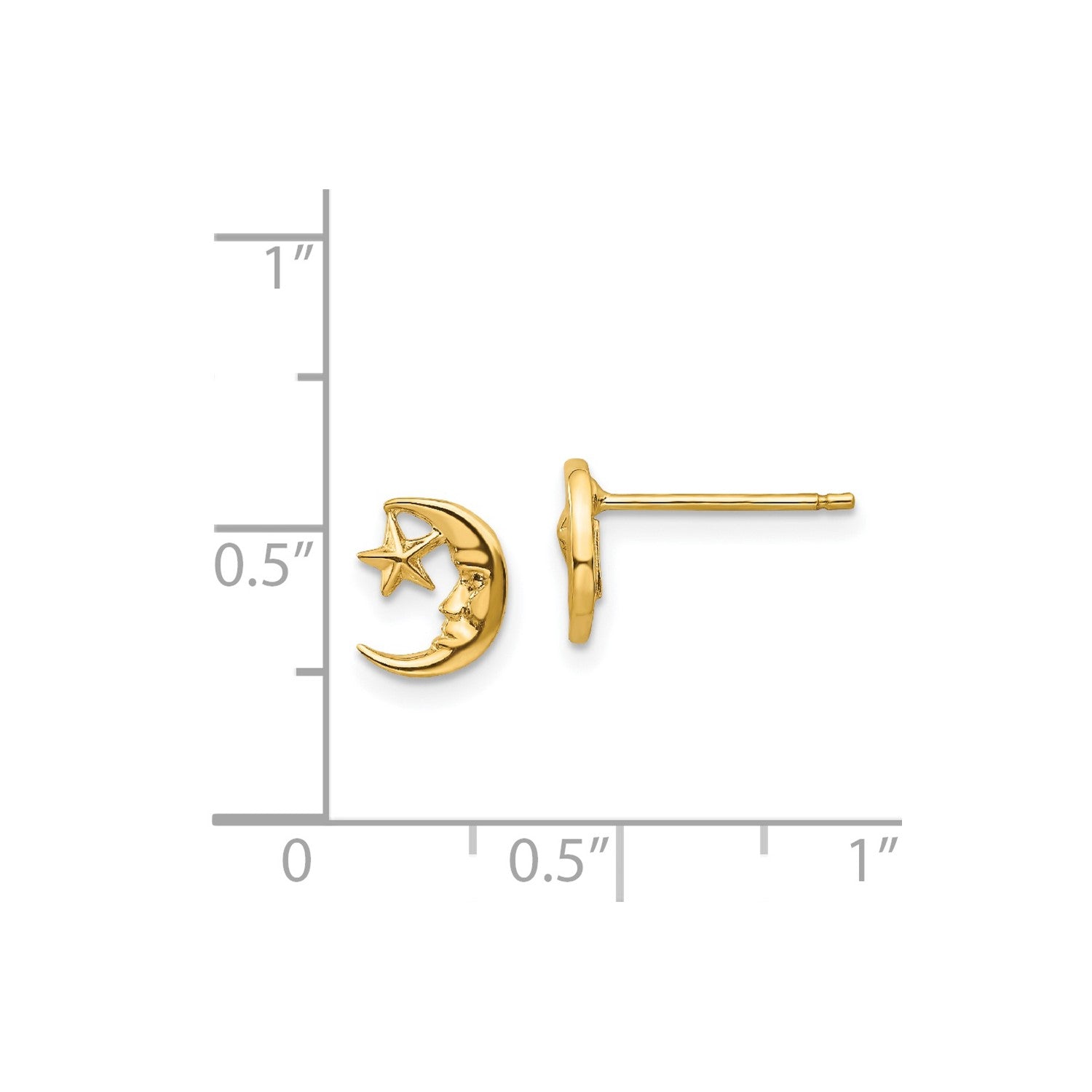 Elevate your style with these exquisite 14k yellow real gold half moon and star post stud earrings. Crafted with meticulous attention to detail, these earrings feature a celestial design that captures the enchanting beauty of the night sky. The crescent moon and twinkling star studs are expertly crafted from solid 14k yellow gold, ensuring lasting brilliance and durability. With a delicate yet eye-catching presence, these earrings effortlessly complement any ensemble, whether you're dressing up for a special occasion or adding a touch of elegance to your everyday look.