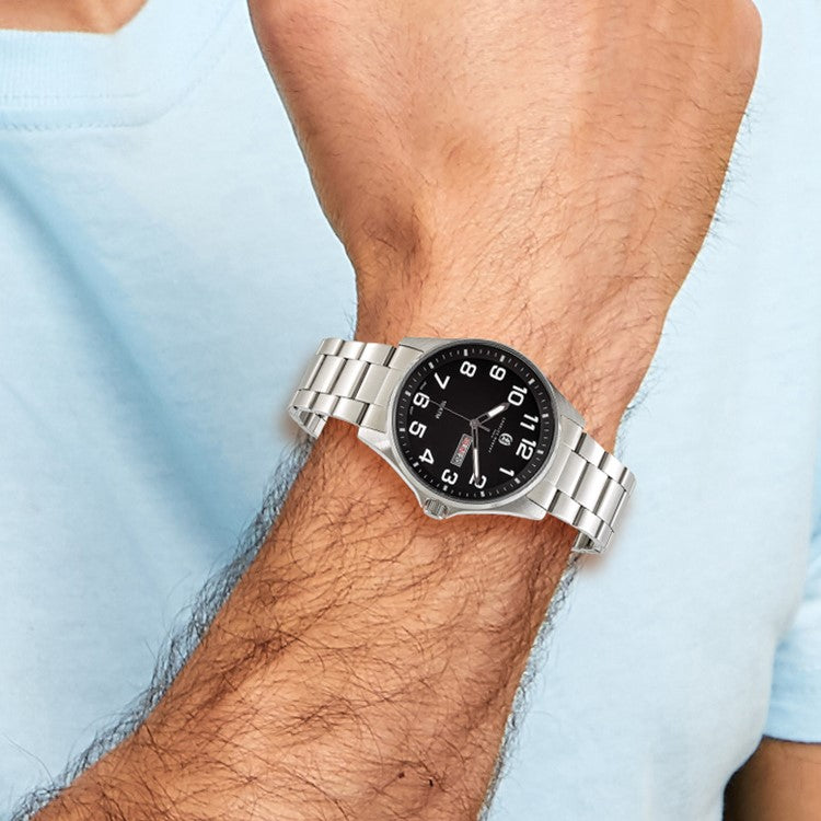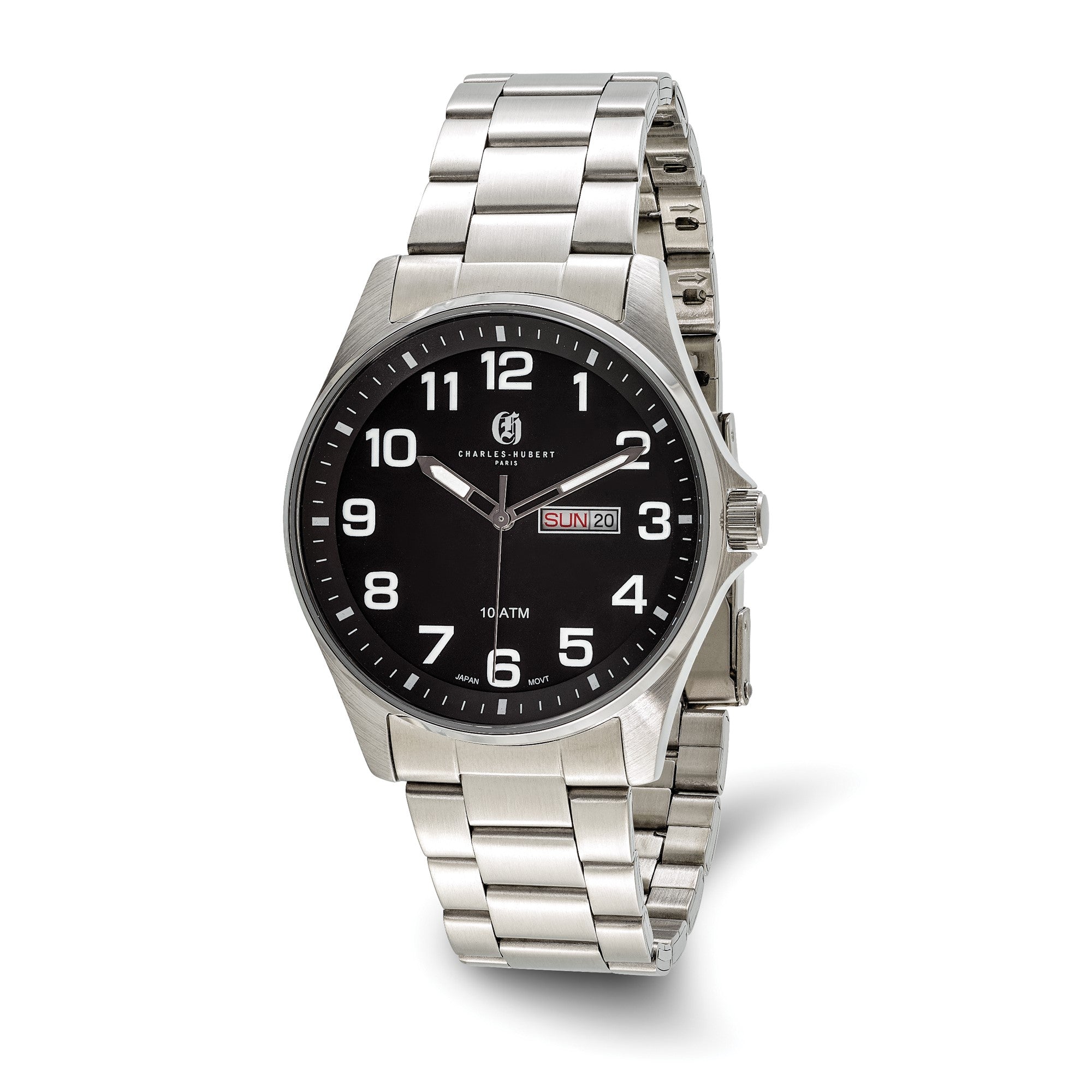 Framed by a rotating diver's bezel this classic Charles-Hubert watch features a stainless steel case, a screw down crown, scratch resistant mineral crystal, a black dial, luminous hands and markers, an outside minute track, a magnified date window and it is water resistant up to 100 feet or 30 meters (3 ATM tested). A reliable Japanese Quartz movement powers the 3-hand timepiece that is finished with a screwdown stainless steel caseback and stainless steel panther link wristband with a deployment buckle. Presented in a custom gift box, it also includes a lifetime warranty for the watch movement and a one-year limited warranty against manufacturing defects. Case size 42mm. Band width 22mm. Length 8.25 inches.