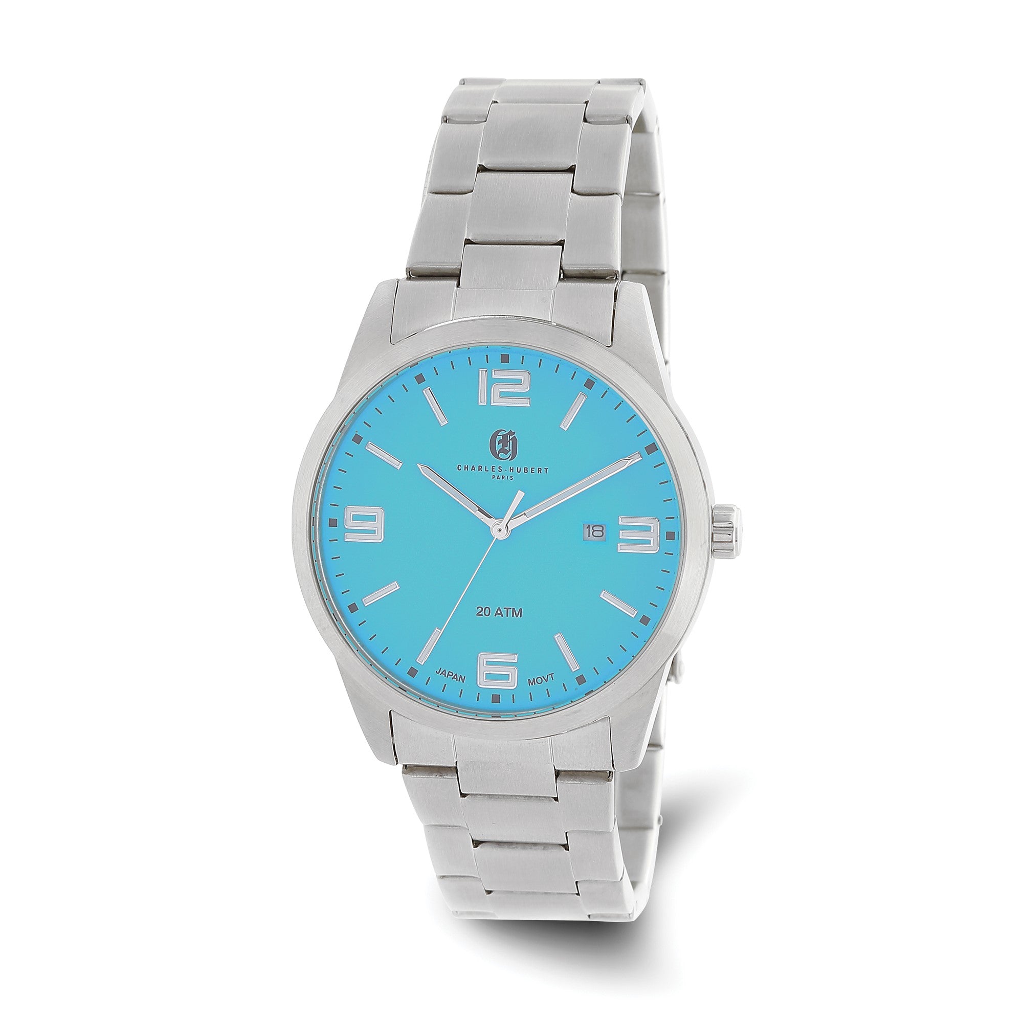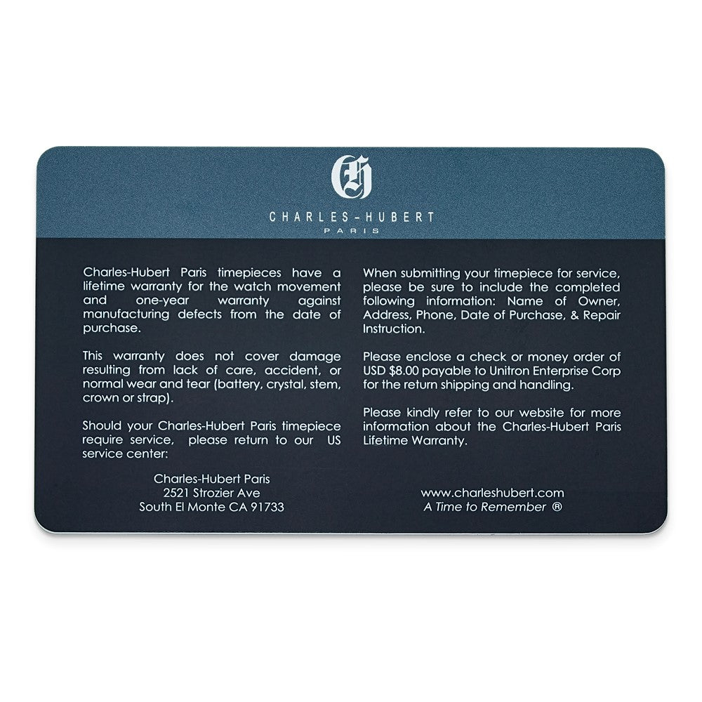 Framed by a rotating diver's bezel this classic Charles-Hubert watch features a stainless steel case, a screw down crown, scratch resistant mineral crystal, a blue dial, luminous hands and markers, an outside minute track, a magnified date window and it is water resistant up to 100 feet or 30 meters (3 ATM tested). A reliable Japanese Quartz movement powers the 3-hand timepiece that is finished with a screwdown stainless steel caseback and stainless steel panther link wristband with a deployment buckle. Presented in a custom gift box, it also includes a lifetime warranty for the watch movement and a one-year limited warranty against manufacturing defects. Case size 42mm. Band width 22mm. Length 8.25 inches.