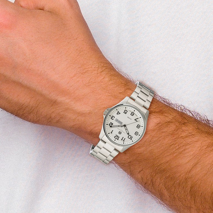 Framed by a rotating diver's bezel this classic Charles-Hubert watch features a stainless steel case, a screw down crown, scratch resistant mineral crystal, a white dial, luminous hands and markers, an outside minute track, a magnified date window and it is water resistant up to 100 feet or 30 meters (3 ATM tested). A reliable Japanese Quartz movement powers the 3-hand timepiece that is finished with a screwdown stainless steel caseback and stainless steel panther link wristband with a deployment buckle. Presented in a custom gift box, it also includes a lifetime warranty for the watch movement and a one-year limited warranty against manufacturing defects. Case size 42mm. Band width 22mm. Length 8.25 inches.