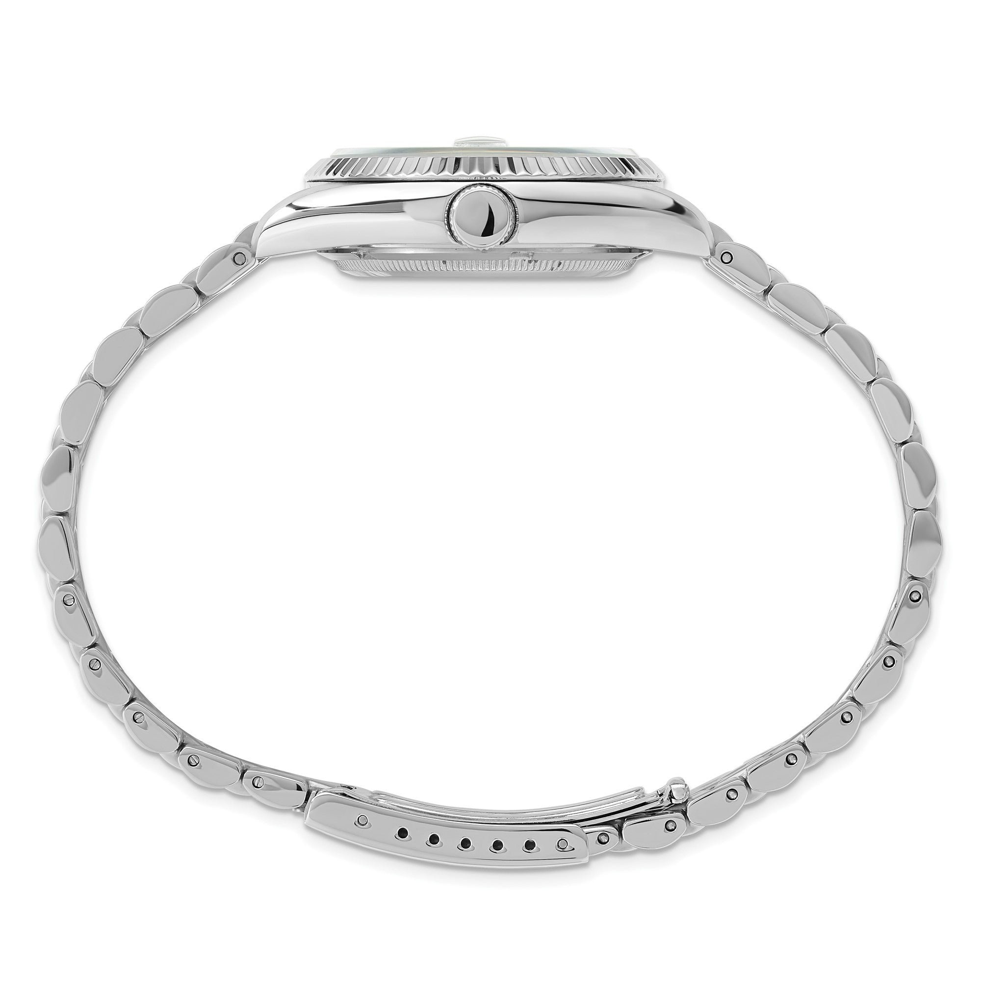 Framed by a rotating diver's bezel this classic Charles-Hubert watch features a stainless steel case, a screw down crown, scratch resistant mineral crystal, a black dial, luminous hands and markers, an outside minute track, a magnified date window and it is water resistant up to 100 feet or 30 meters (3 ATM tested). A reliable Japanese Quartz movement powers the 3-hand timepiece that is finished with a screwdown stainless steel caseback and stainless steel panther link wristband with a deployment buckle. Presented in a custom gift box, it also includes a lifetime warranty for the watch movement and a one-year limited warranty against manufacturing defects. Case size 35mm. Band width 20mm. Length 8.25 inches.