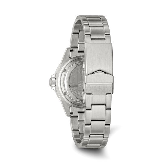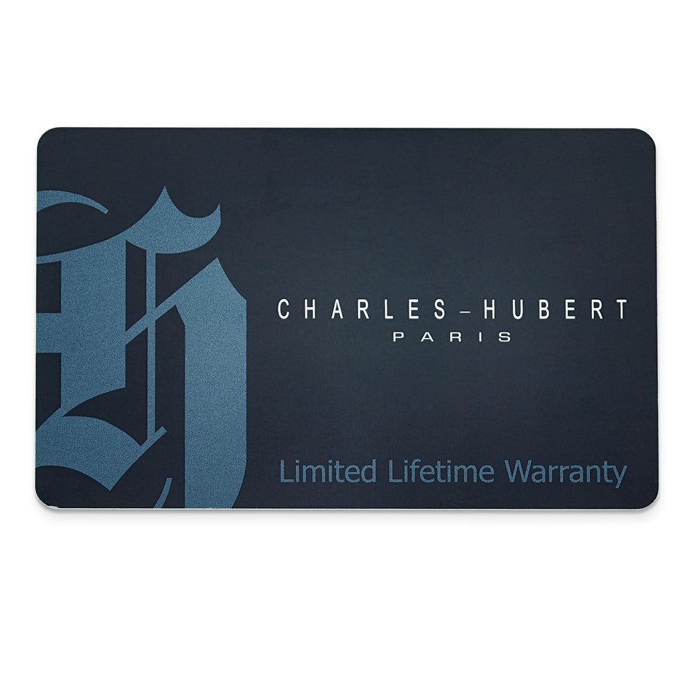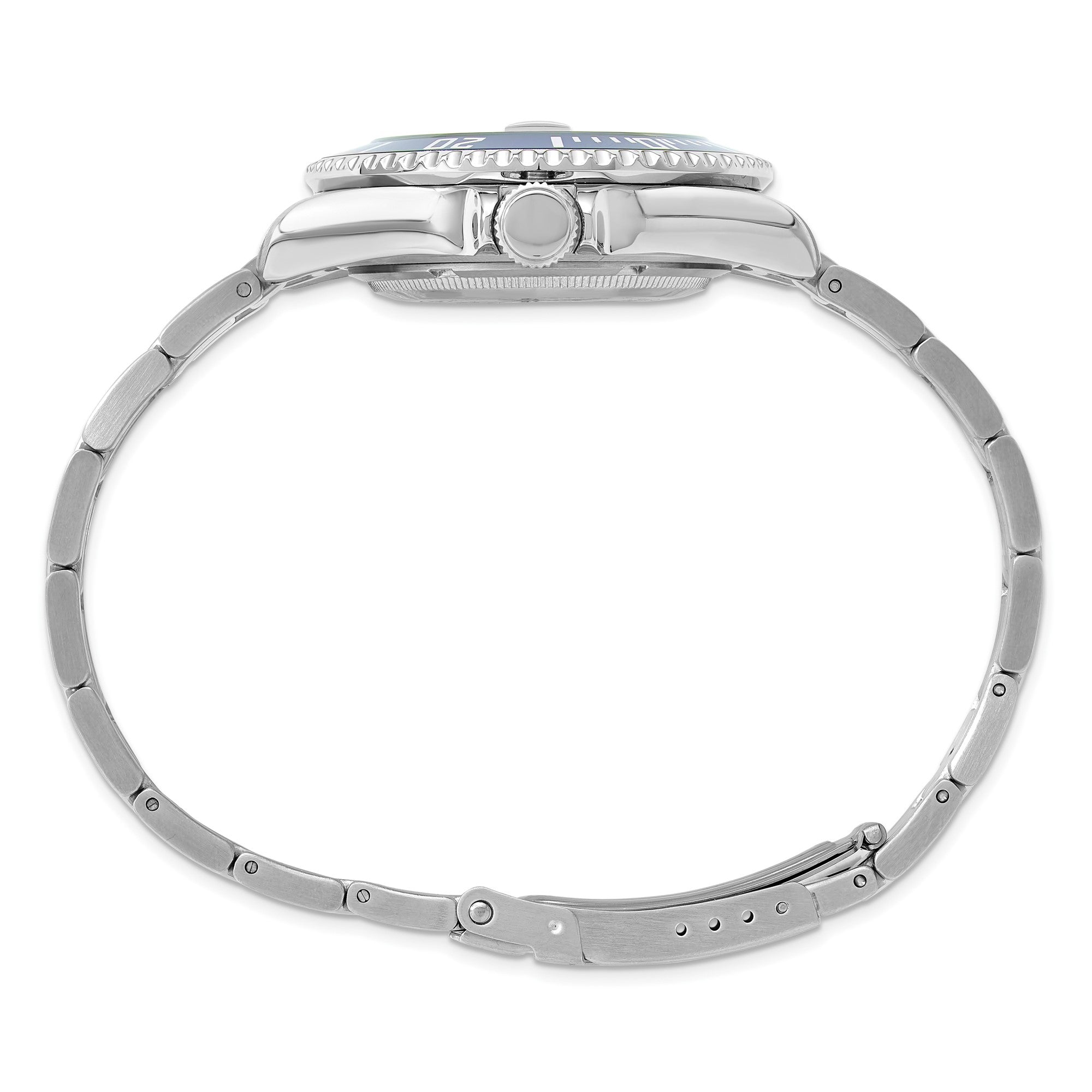 Framed by a rotating diver's bezel this classic Charles-Hubert watch features a stainless steel case, scratch resistant mineral crystal, a blue dial, luminous hands and markers, an outside minute track, a magnified date window, a screw down crown, and it is water resistant up to 165 feet or 50 meters (5 ATM tested). A reliable Japanese Quartz movement powers the 3-hand timepiece that is finished with a screw down stainless steel caseback and panther link wristband with a deployment buckle. Presented in a custom gift box, it also includes a lifetime warranty for the watch movement and a one-year warranty against manufacturing defects. Approximate case size 40mm, band width 20mm, and bracelet length 8.25 inches.