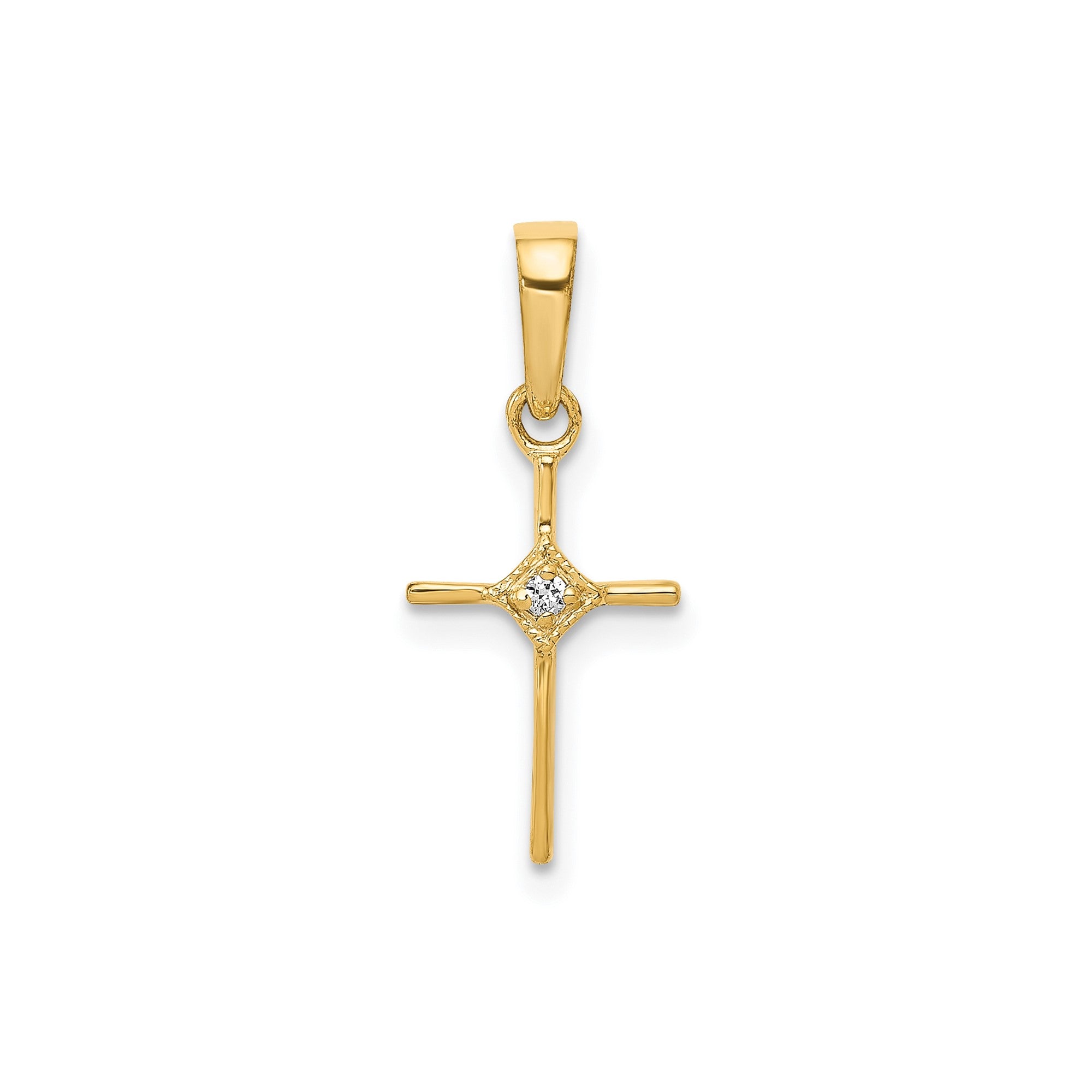 Elevate your spiritual expression with this exquisite solid gold cross pendant featuring a stunning diamond centerpiece. Meticulously crafted with attention to detail, this religious pendant measures 20x8mm - a perfect size that makes a meaningful statement while remaining elegantly understated. The brilliant diamond is expertly set in a distinctive diamond-shaped mounting at the cross's center, creating a beautiful focal point that catches the light from every angle. Available in both classic sterling silver and luxurious gold finishes, this pendant combines traditional religious symbolism with contemporary jewelry design. The smooth, polished arms of the cross extend gracefully from the center, creating clean lines that complement any chain or necklace. This meaningful piece serves as both a personal expression of faith and a sophisticated jewelry accessory suitable for daily wear or special occasions. The pendant's superior craftsmanship ensures lasting beauty and durability, making it an ideal choice for both personal use and thoughtful gifting.